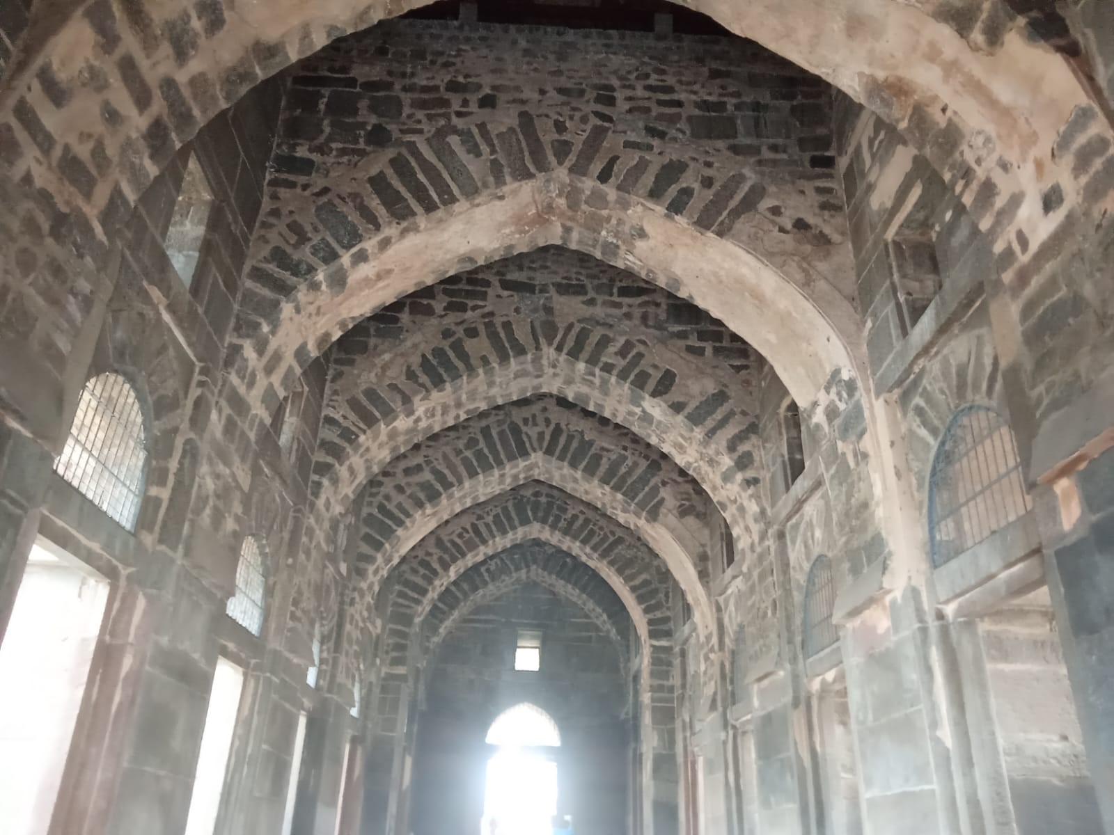 The front side of the building features an arched entrance, a prominent feature in Indo-Sarcenic architecture, which reflects the aesthetic and structural innovations of the period. The hall inside, with its arched ceiling, is an impressive example of medieval engineering.